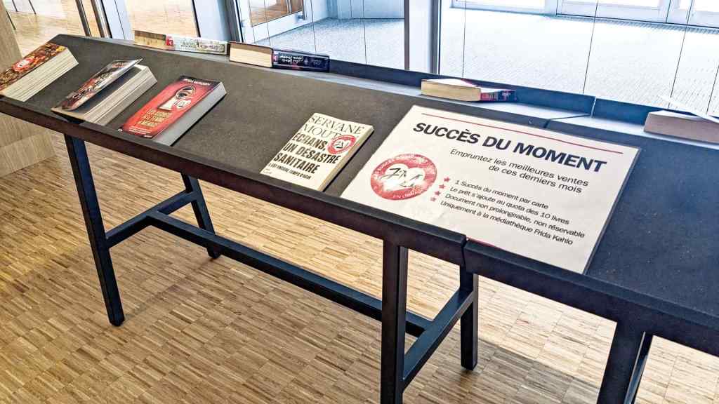 Le ton est également donné avec le présentoir des meilleures ventes en librairies, réassorti toutes les semaines au rythme de la publication du classement des bestsellers, sans choix ni jugement des bibliothécaires sur son contenu. Attention accrochez-vous, les livres sont commandés tous les vendredis pour être mis en rayon au maximum le mercredi suivant !