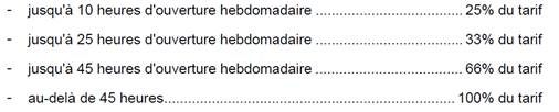 235.08 € TTC (118.06 en Sacem et 117.02 en Spré) par an , abattement en Sacem possible selon les heures d’ouverture hebdomadaire :